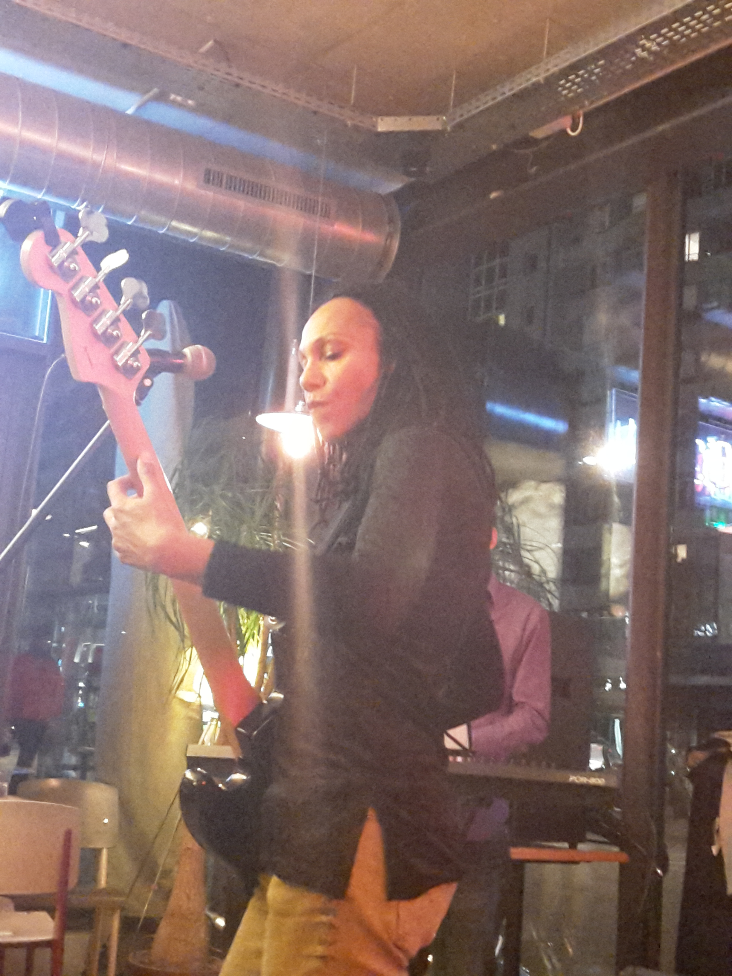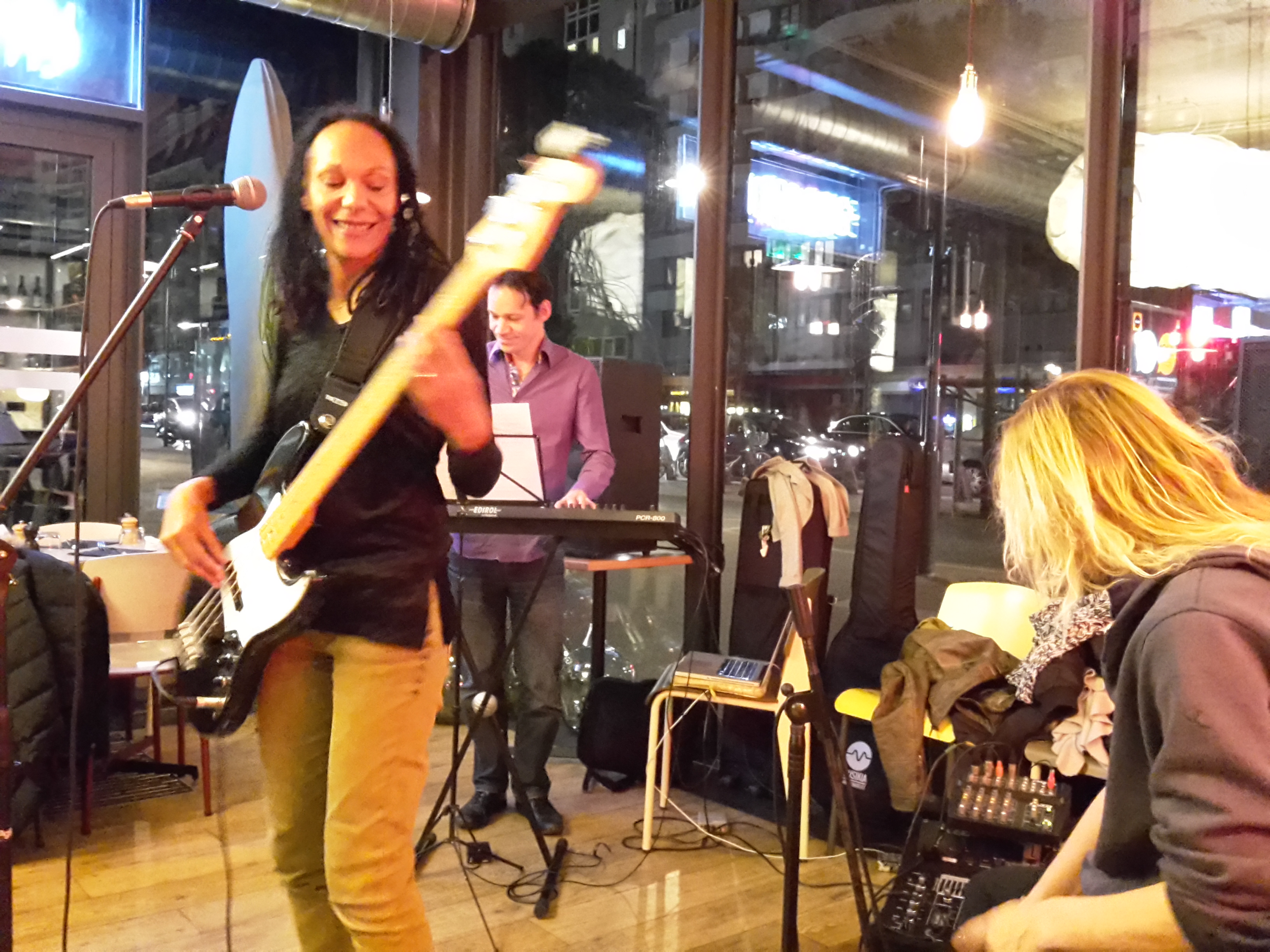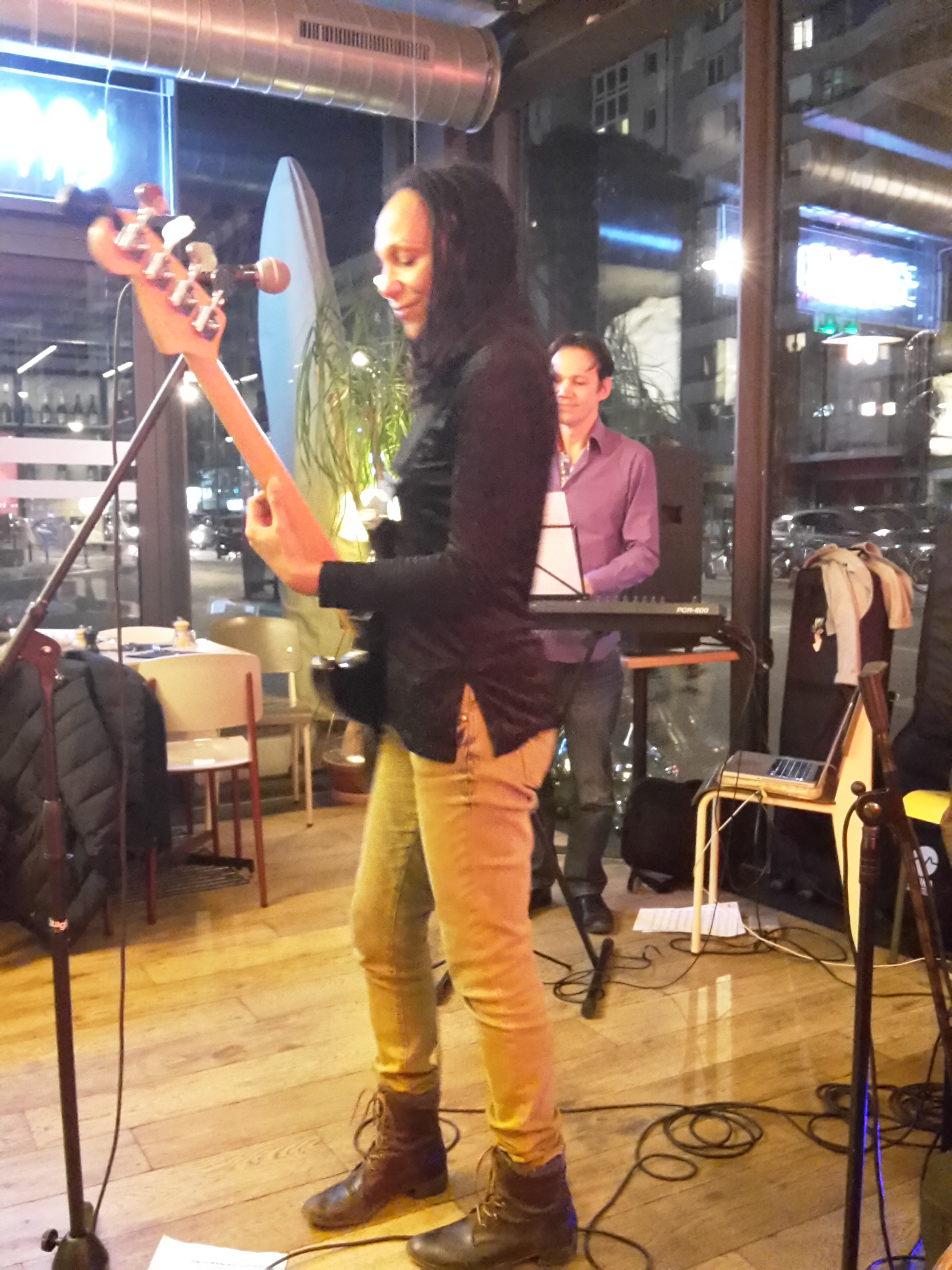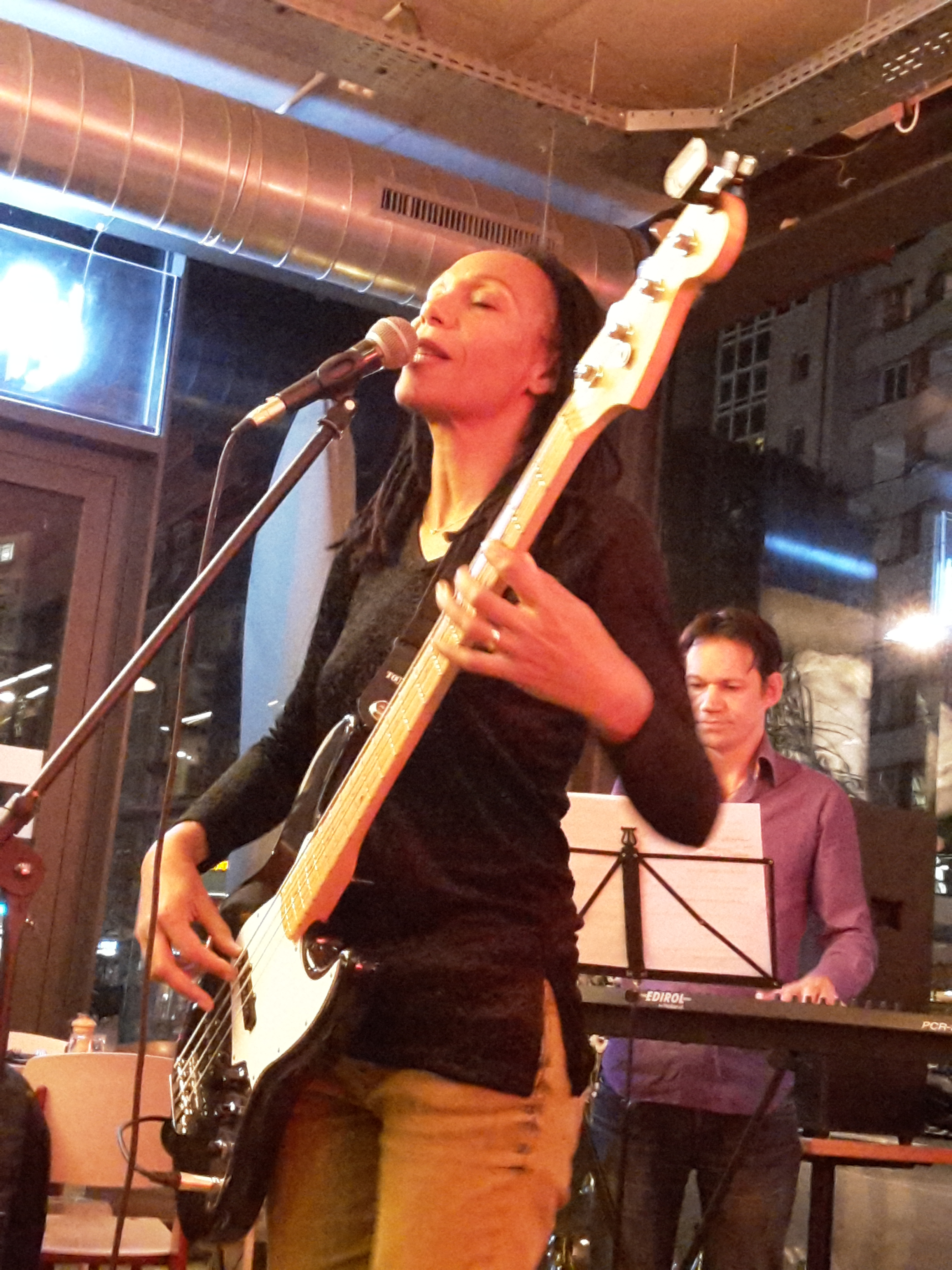 Mon premier concert est à Tancrou dans le 77. C’est un copain bassiste qui m’a mis sur le coup. L’association musicale du petit village organise un concert avec Nassim Dendane et ils ont besoin d’une première partie. J’accepte, bien que je me sente encore un peu juste pour le live. En effet, dans cette formule où je suis seule, j’assure la basse et la voix sur le Play Back des musiciens préenregistré, et après 1 mois 1/2 de répétition, mes doigts ne sont pas encore tout à fait « automatisés ».