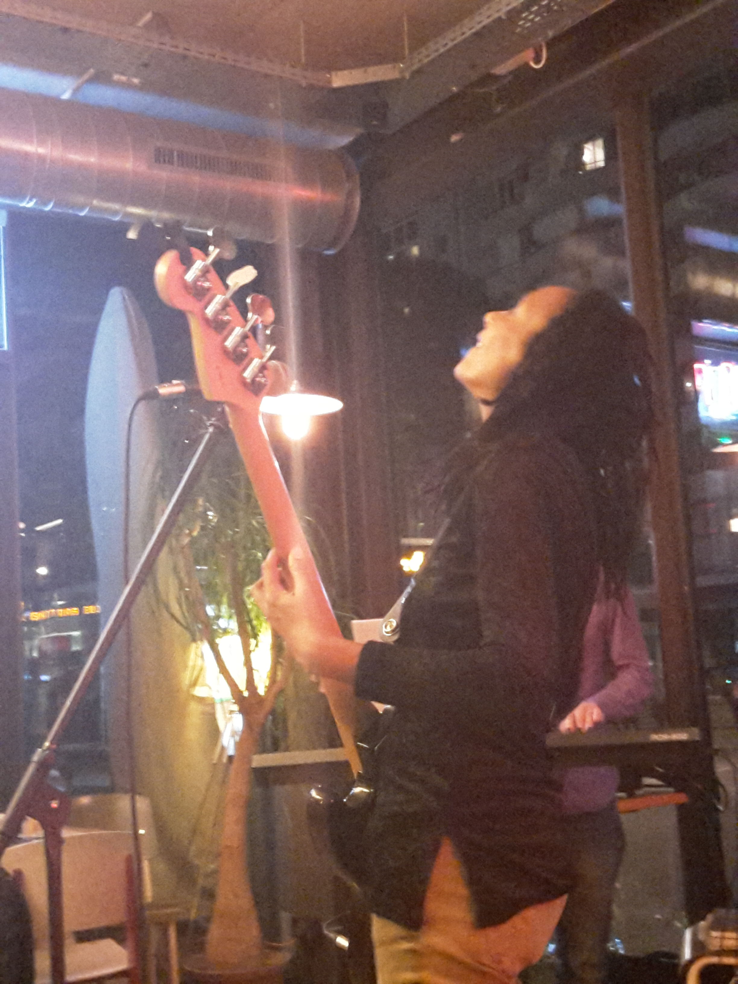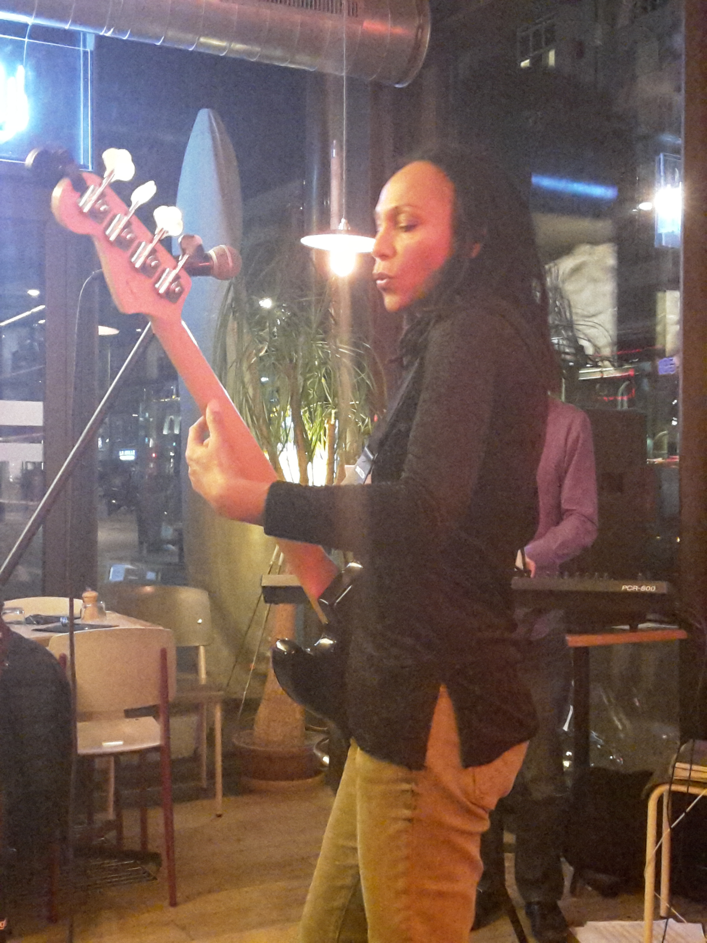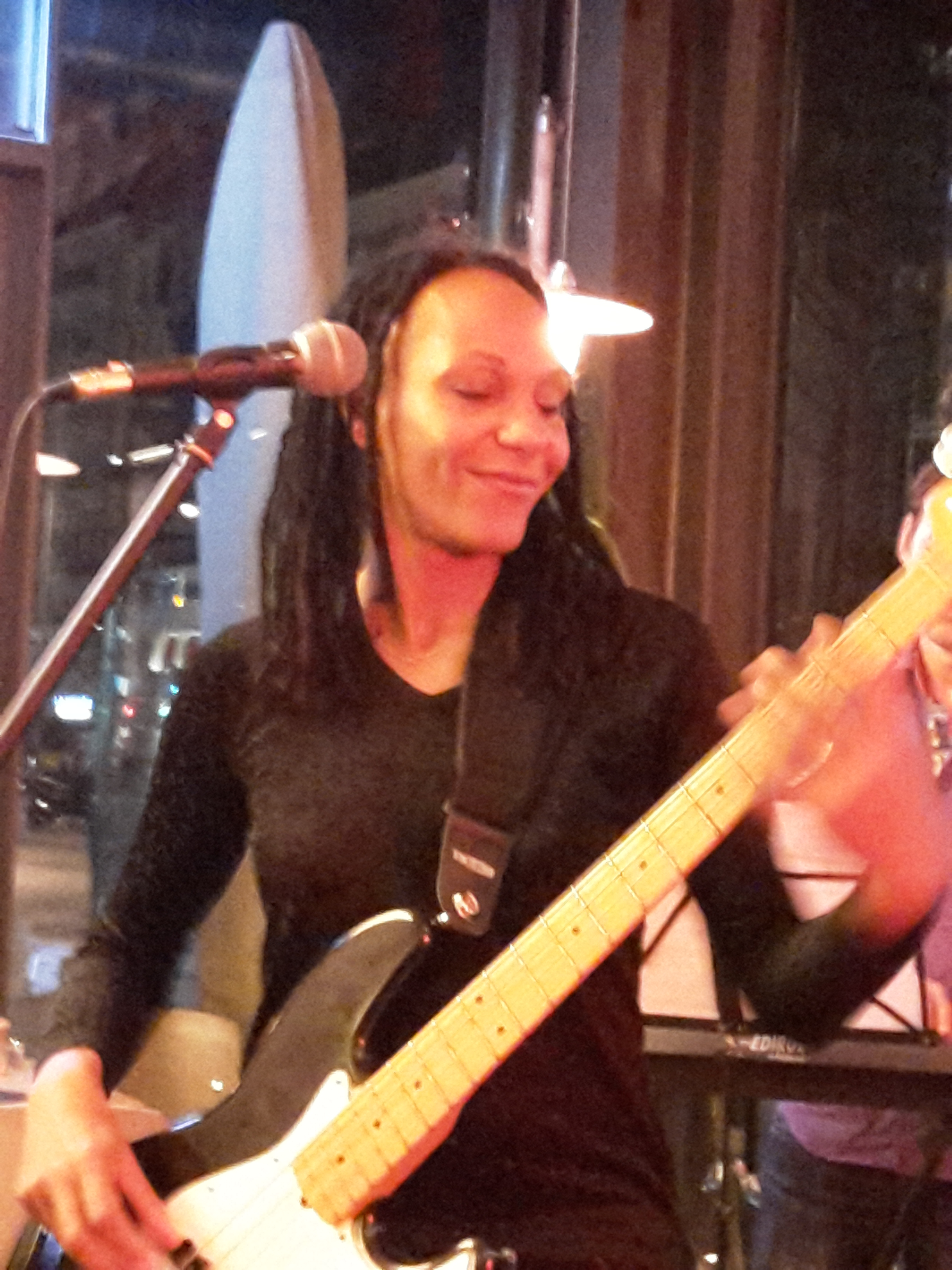 Mon premier concert est à Tancrou dans le 77. C’est un copain bassiste qui m’a mis sur le coup. L’association musicale du petit village organise un concert avec Nassim Dendane et ils ont besoin d’une première partie. J’accepte, bien que je me sente encore un peu juste pour le live. En effet, dans cette formule où je suis seule, j’assure la basse et la voix sur le Play Back des musiciens préenregistré, et après 1 mois 1/2 de répétition, mes doigts ne sont pas encore tout à fait « automatisés ».