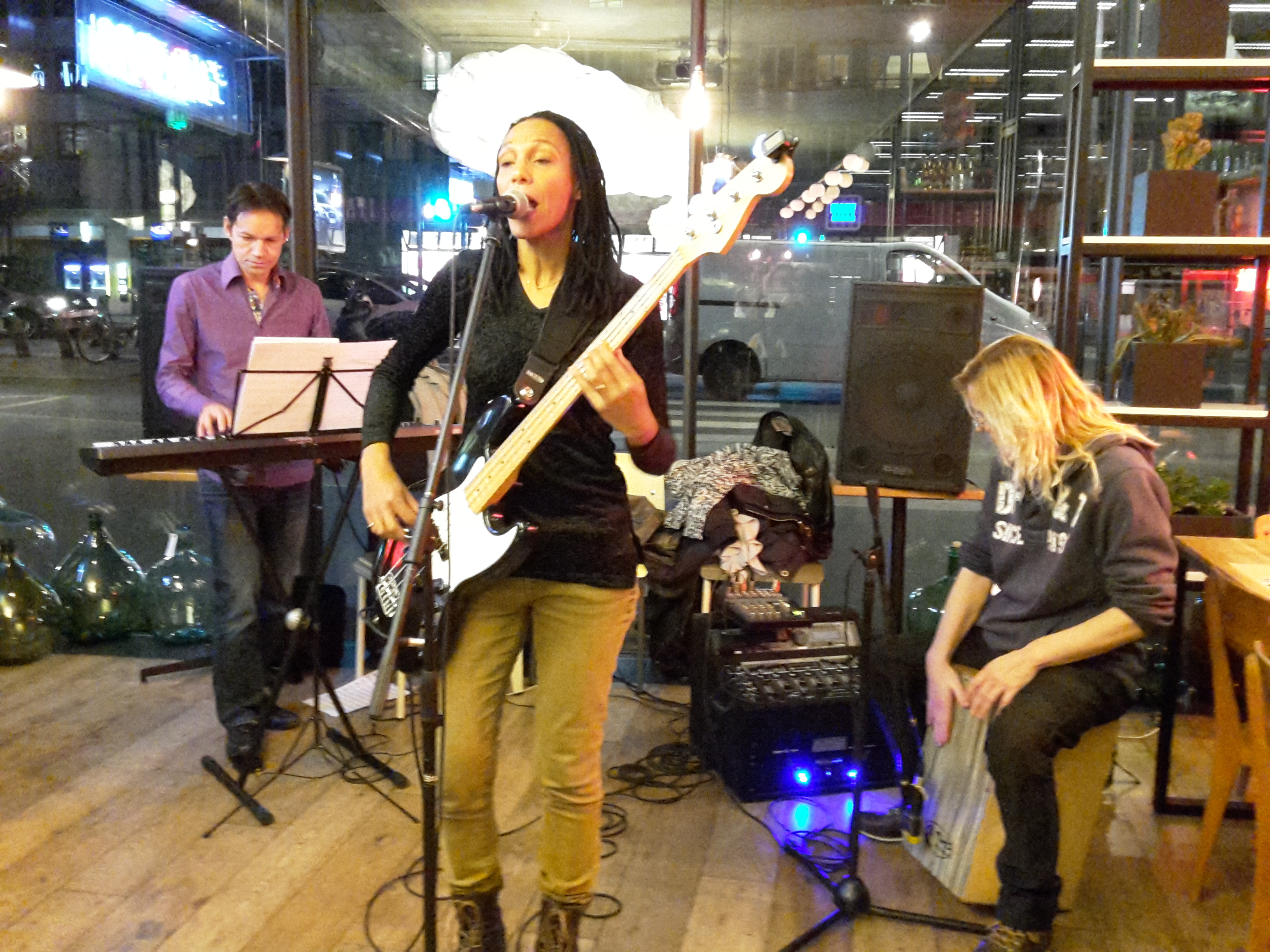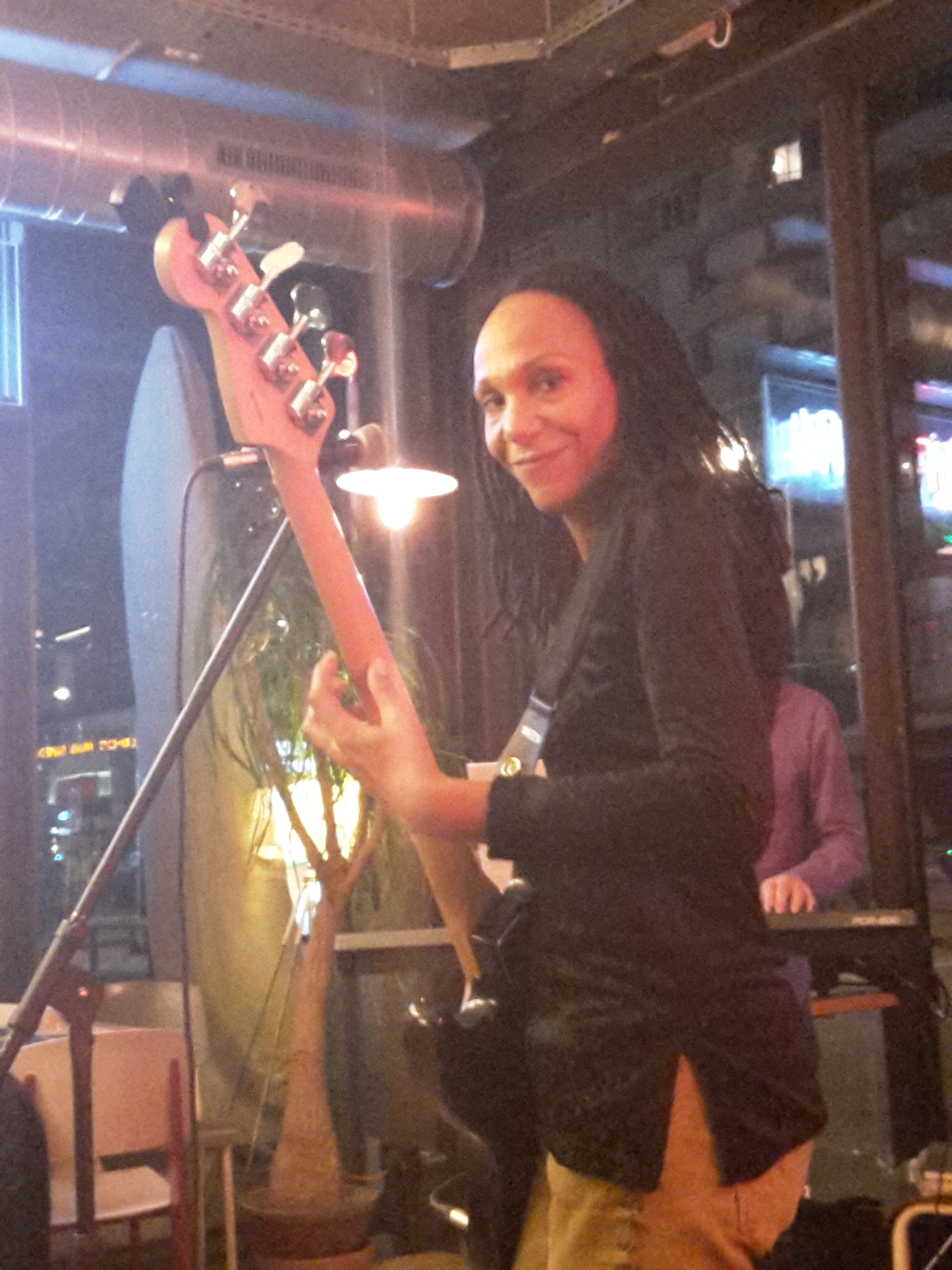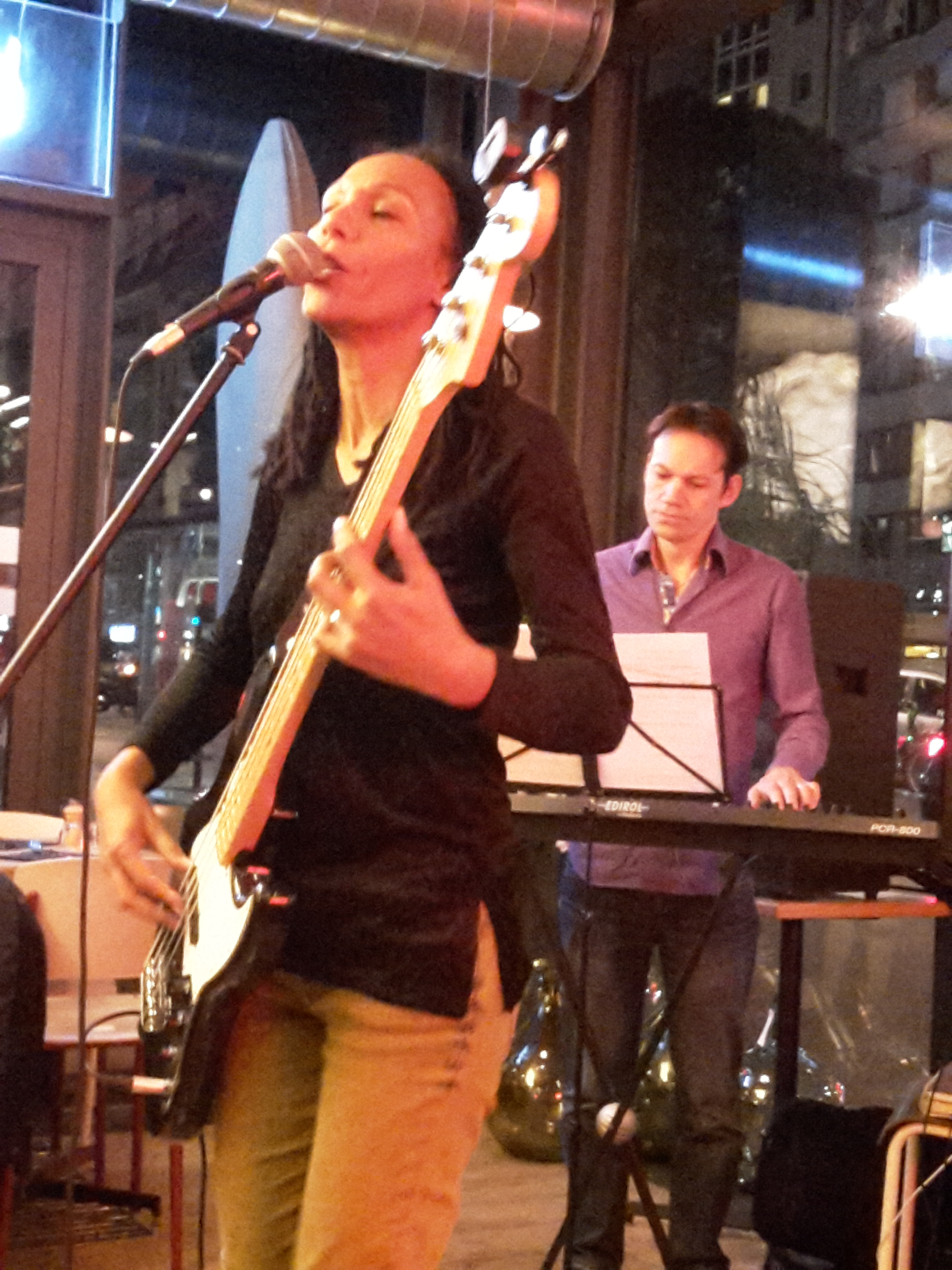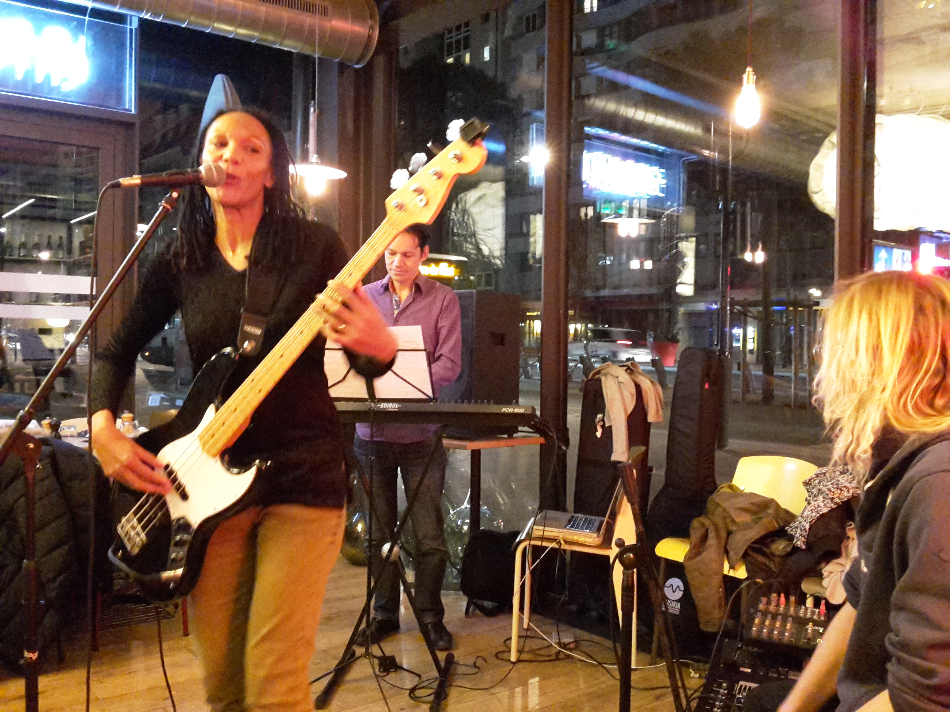 Mon premier concert est à Tancrou dans le 77. C’est un copain bassiste qui m’a mis sur le coup. L’association musicale du petit village organise un concert avec Nassim Dendane et ils ont besoin d’une première partie. J’accepte, bien que je me sente encore un peu juste pour le live. En effet, dans cette formule où je suis seule, j’assure la basse et la voix sur le Play Back des musiciens préenregistré, et après 1 mois 1/2 de répétition, mes doigts ne sont pas encore tout à fait « automatisés ».